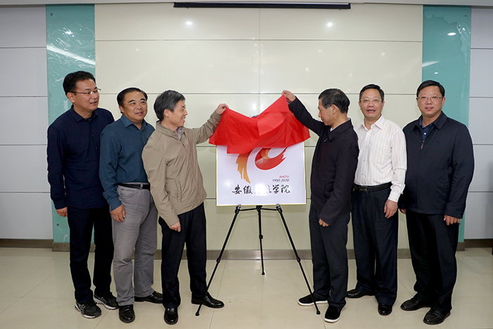 庆徽标识的配色采用了中国庆典色传统基调,“红色”与“黄色”渐变组合,红色寓代表激情岁月和蓬勃朝气,黄色渐变金色代表辉煌业绩和完美品质,呈现出喜庆欢乐的乐章。右下侧的“AHSTU”为学校英文名称的缩写,“1950—2020”则寓意着学校始建于1950年,到2020年已经走过了70年办学历程。