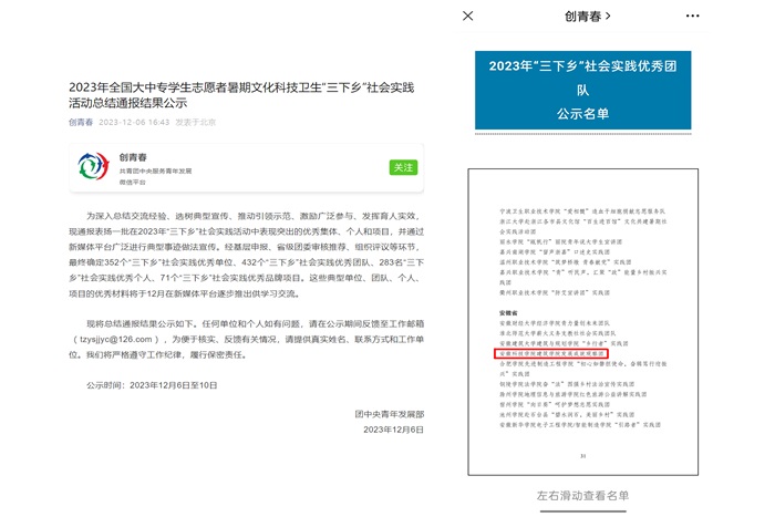 12月6日,共青团中央发布2023年全国大中专学生志愿者暑期文化科技卫生“三下乡”社会实践活动总结通报结果,大棋牌建筑学院“拾遗”发展成就观察团脱颖而出,荣获全国“2023年‘三下乡’社会实践优秀团队”称号。