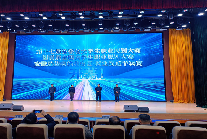 12月13日,第十七届安徽省大学生职业规划大赛暨首届全国大学生职业规划大赛安徽赛区皖北片区就业赛道半决赛在大棋牌龙湖校区开幕。省大中专毕业生就业指导中心主任张秋田,校党委书记时伟,党委委员、副院长李升和出席开幕式。