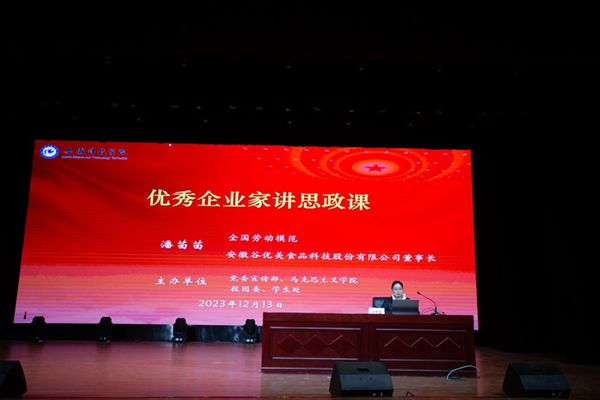 为认真贯彻落实习近平总书记关于思想政治理论课建设的重要讲话精神和党中央的决策部署,落实教育部等部门印发的《全面推进“大思政课”建设的工作方案》文件要求,充分调动全社会力量和资源,推动思政小课堂与社会大课堂相结合,挖掘一切育人资源,发挥榜样人物的示范引领作用,形成强大育人合力,激励广大学生崇尚先进、学习先进、争做先进,教育引导学生坚定“四个自信”。12月13日上午,由校党委宣传部、马克思主义学院、校团委、学生处共同举办的“优秀企业家讲思政课”在凤阳校区大学生活动中心举行。此次邀请全国劳模、安徽谷优美食品科技股份有限公司董事长潘苗苗讲授创业思政课。近200名学生和马克思主义学院老师参加活动,活动由马克思主义学院院长张德化主持。