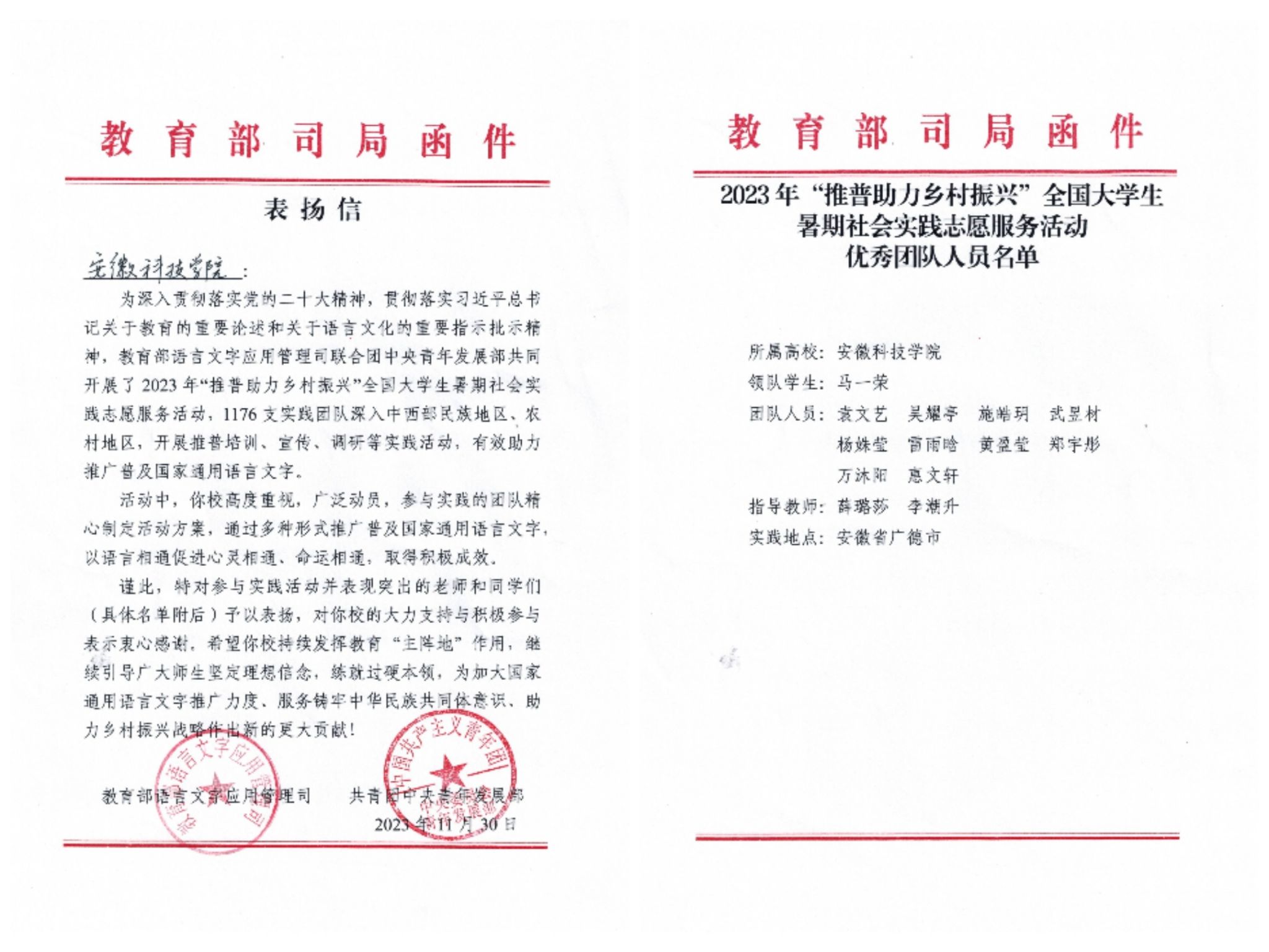 大棋牌化学与材料工程学院“推普助力乡村振兴”暑期“三下乡”社会实践团队荣获2023年“推普助力乡村振兴”全国大学生暑期社会实践志愿服务活动“优秀团队”。1月17日,教育部语言文字应用管理司、共青团中央青年发展部向大棋牌实践团队发来表扬信。