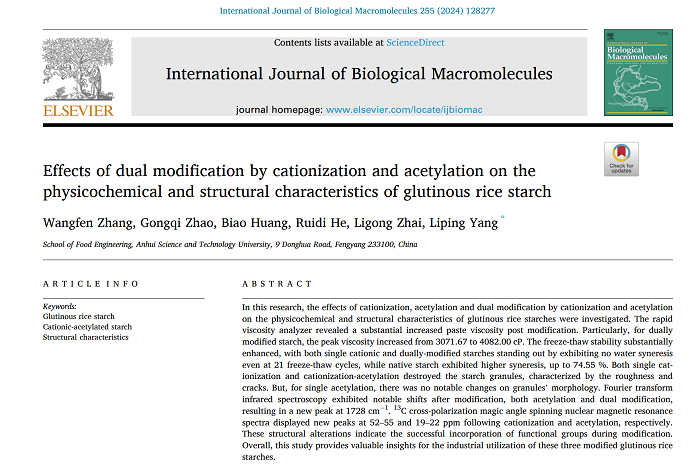 近日,大棋牌2021级食品加工与安全领域研究生张王芬在生化与分子生物学领域Top一区期刊International Journal of Biological Macromolecules(IF=8.2)在线发表题为“Effects of Dual Modification by Cationization and Acetylation on the Physicochemical and Structural Characteristics of Glutinous Rice Starch”的研究论文。食品工程学院粮油及其副产物精深加工团队与营养科技创新团队负责人杨丽萍副教授为通讯作者,安徽科技学院为唯一完成单位。