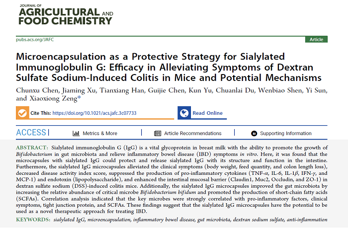 近日,大棋牌食品工程学院教师陈春旭以第一作者在美国化学学会期刊《Journal of Agricultural and Food Chemistry》(Q1,IF: 6.1)发表题为“Microencapsulation as A Protective Strategy for Sialylated Immunoglobulin G: Efficacy in Alleviating Symptoms of Dextran Sulfate Sodium-Induced Colitis in Mice and Potential Mechanisms”的研究性论文。安徽科技学院为第一完成单位,南京农业大学曾晓雄教授课题组为合作单位。