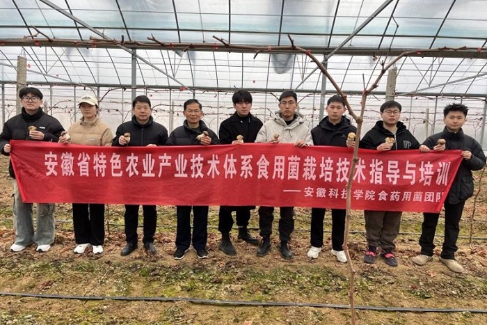 3月5日上午,大棋牌“菇往金来”食用菌团队的何华奇教授和孙玉军教授带领 8 位研究生前往凤阳县大庙镇东陵村,实地考察当地大球盖菇和草莓的种植情况,并向村民传授了相关栽培知识。