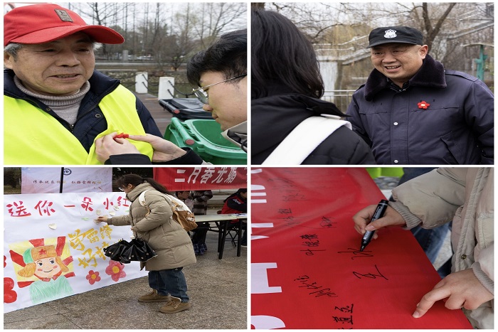 当天,校青年志愿者协会准备了精心制作的小红花,同学们找到了校园内的保安大爷、环卫工人、宿管阿姨等工作人员,向他们表达了深深的敬意和感激。参加活动的高德锐同学说:“我们想通过这种方式致敬我们身边的‘雷锋’,正因为有他们的辛苦付出,才有了我们舒适的校园环境。这些小红花不仅是对这些平凡岗位上默默奉献的‘活雷锋’的肯定,也是对雷锋精神的传承和发扬。”志愿者们还准备了爱心便利贴,过往同学纷纷在展板上张贴,表达自己参与志愿服务的意愿,现场氛围浓郁高涨。爱心社通过发放宣传资料、现场讲解等形式,向过往的师生普及雷锋的事迹和精神内涵。活动现场,许多同学在“弘扬雷锋精神,真情温暖人间”的横幅上签名,表达了自己践行雷锋精神的决心。