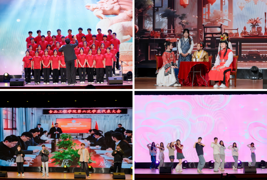 合唱《春天的故事》与《在希望的田野上》如梦如幻,如诗如画,洋溢着春天的生机和希望,温暖了整个会场;院歌《春华秋实》的旋律如涓涓细流,深情而悠扬,将师生们对学院的热爱与祝福融入每一个音符之中,在每一个节拍里跳动;话剧《刘姥姥进大观园》,仿佛打开了一幅流动的历史画卷,红衣绸罗,跨越百年,演绎着食品文化的博大精深;古典舞《采茶》随着优美的旋律,充分展示了采茶文化的独特魅力;接着《中华美食颂》的旋律响起,以美食为媒,歌颂了中华文化的深厚底蕴和美食的诱人魅力;走秀《魅力舞台》以及舞蹈《Yes OK》生机蓬勃,充分展现了食院学子的青春朝气。最终,晚会在师生共同欢唱《相亲相爱》中圆满结束。