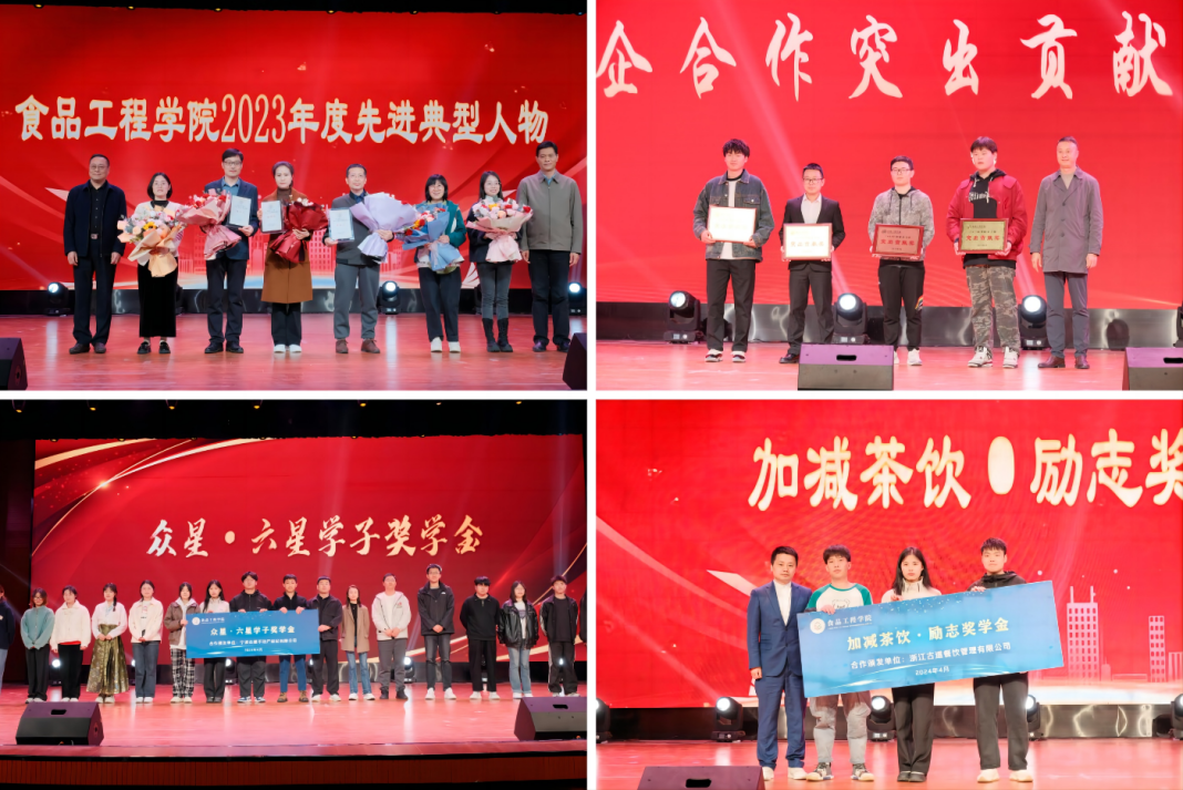 会上,举行了云升大件·优秀排球运动员奖学金和优秀田径运动员奖学金、众星·六星学子奖学金、一鸣启智·十佳大学生奖学金、加减茶饮·励志奖学金、院企合作突出贡献奖以及食品工程学院2023年度先进典型人物颁奖仪式。