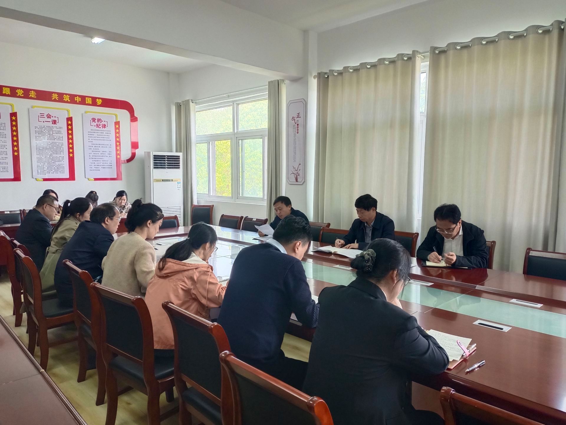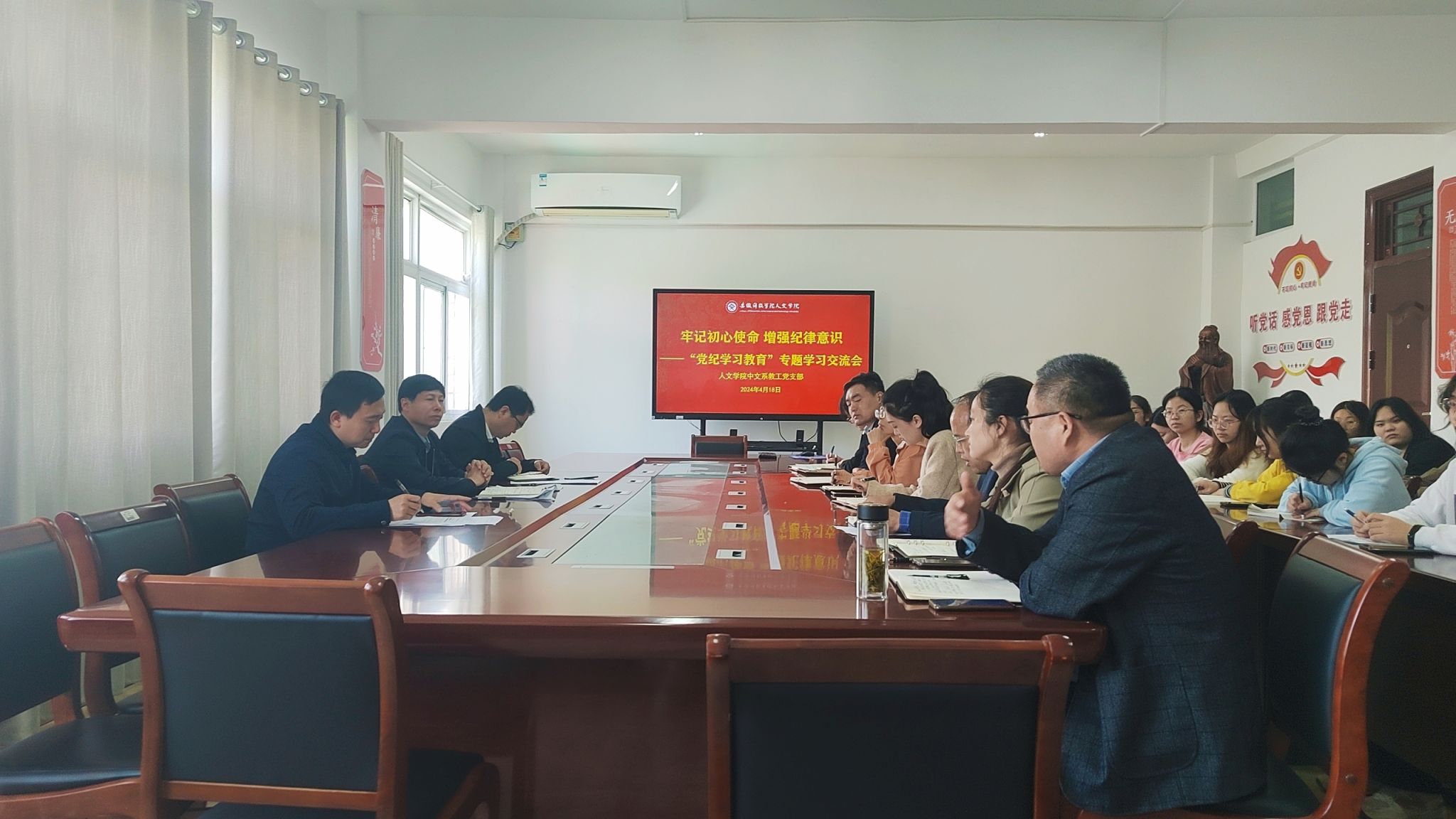 4月18日上午,根据学校党委关于开展党纪学习教育统一部署和人文学院党委《大棋牌全体党员集中研读<中国共产党纪律处分条例>条文的通知》(以下简称《条例》),人文学院中文系教工党支部在学知楼324党员活动室召开党纪学习教育专题学习会,校党委书记时伟到会指导。人文学院中文系教工党支部和汉语言文学专业学生党支部全体党员参加,法学系教工党支部书记、系主任张晓云列席。会议由中文系教工党支部书记和建伟主持。