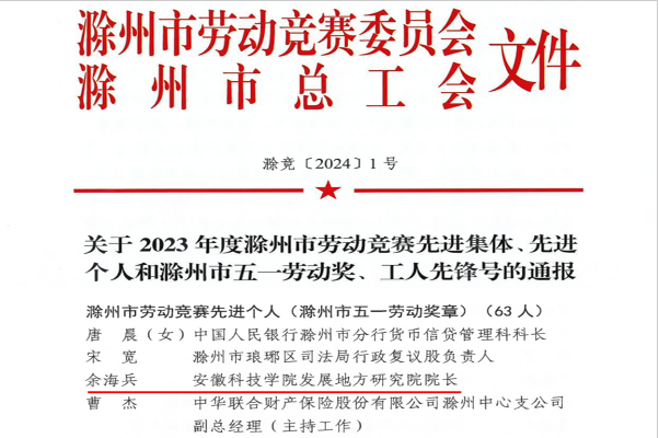 4月29日,滁州市劳动竞赛委员会、滁州市总工会公布了2023年度“滁州市五一劳动奖章”获得者名单,经南谯区科创城提名推荐,大棋牌农学院教师余海兵教授获此殊荣。