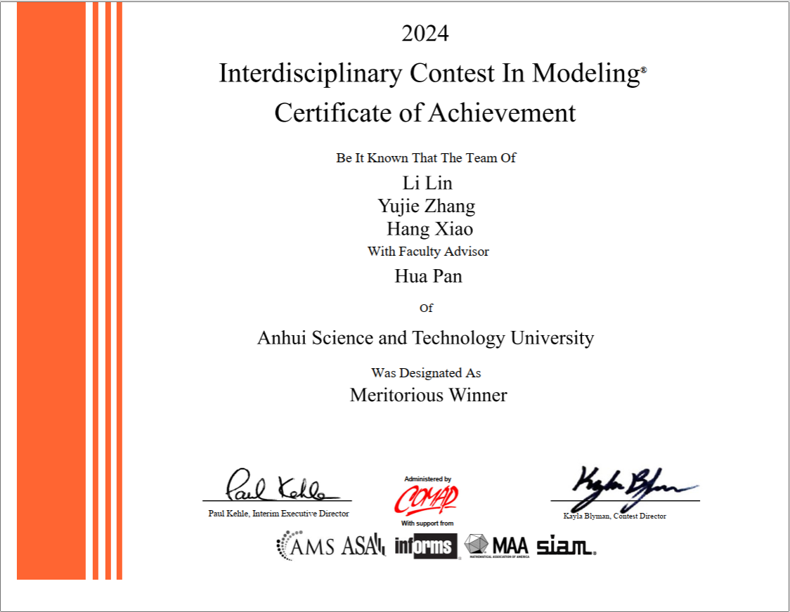 5月8日,2024年美国大学生数学建模竞赛成绩揭晓,大棋牌数据科学与大数据技术专业21级林俐、张玉洁、肖杭三位同学斩获国际一等奖(Meritorious Winner)。其他四支参赛队获二等奖1项(Honorable Mention),三等奖(Successful Participant)3项,取得了大棋牌学生参加该项竞赛以来的最好成绩。