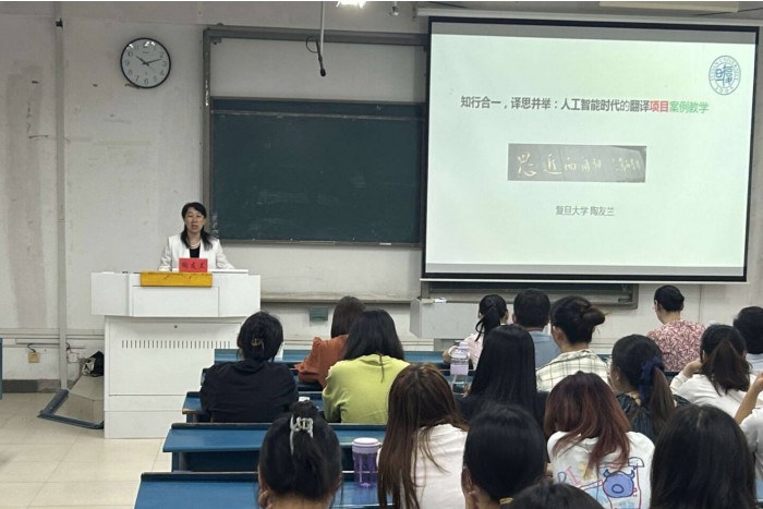 学科专业建设报告会邀请复旦大学外文学院博士生导师、翻译系主任、翻译硕士教育中心主任、国际传播领军人才陶友兰教授现场讲学,指导翻译学科建设、翻译专业人才培养及人工智能时代翻译教学。陶友兰以“知行合一,译思并举:人工智能时代的翻译项目案例教学”为题,围绕人工智能对翻译教育与学习的挑战,深入剖析翻译实践教学面临的问题及对策,以真实翻译项目的案例教学为例,介绍了复旦大学以技术赋能翻译人才培养的举措与经验。关于外国语学院学科专业建设,陶教授紧紧结合外国语学院自身实际,重点分享了翻译学科建设中的问题与对策,提出高层次、应用型及职业化的发展定位,以澳、德、英、美等国及复旦大学的翻译人才培养为案例,阐述经验与启示,解答学科建设中的盲点和痛点。