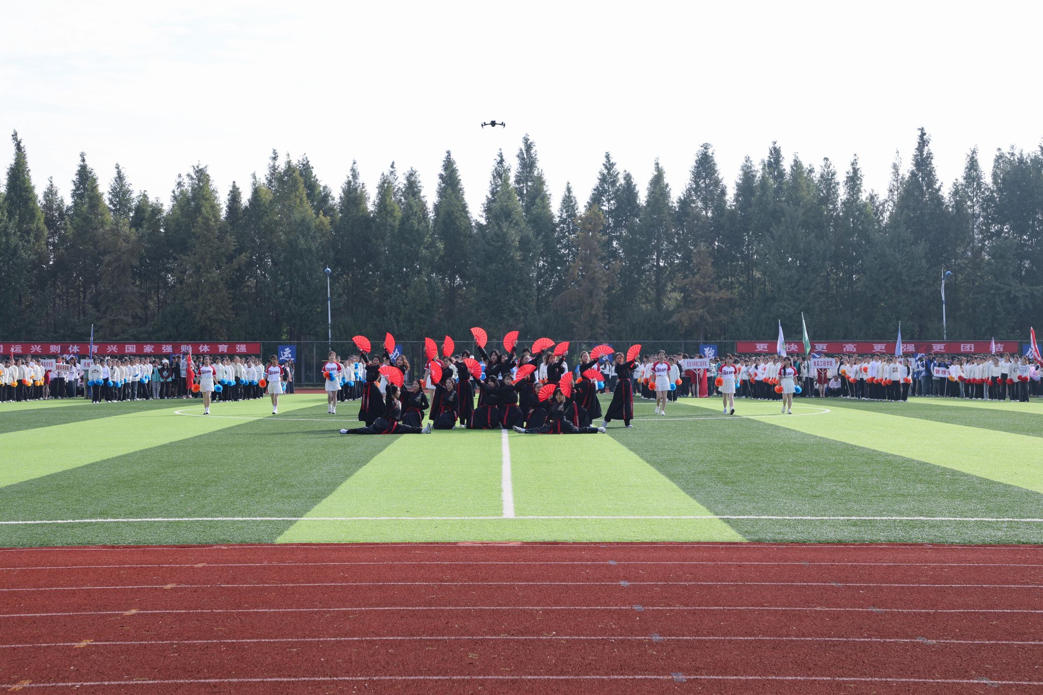 随后的文体表演将开幕式推向高潮。由校操舞队带来的街舞啦啦操舞动全场,他们用精彩的舞姿和饱满的热情为运动健儿们加油;技巧啦啦队动感活泼,尽情展示青春的风采;节奏性强、劲力刚柔相济的响扇舞,展示安科学子积极向上的精神风貌;集体啦啦操和爵士齐舞更是以其独特的动感和节奏引得现场观众连连称赞,展现了大棋牌学子的青春朝气和活力;歌手协会成员们用旋律为运动健儿们助威和喝彩,为现场观众带来一场音乐盛宴,鼓舞每一位安科人以奋进之姿共赴新的赶考之路。