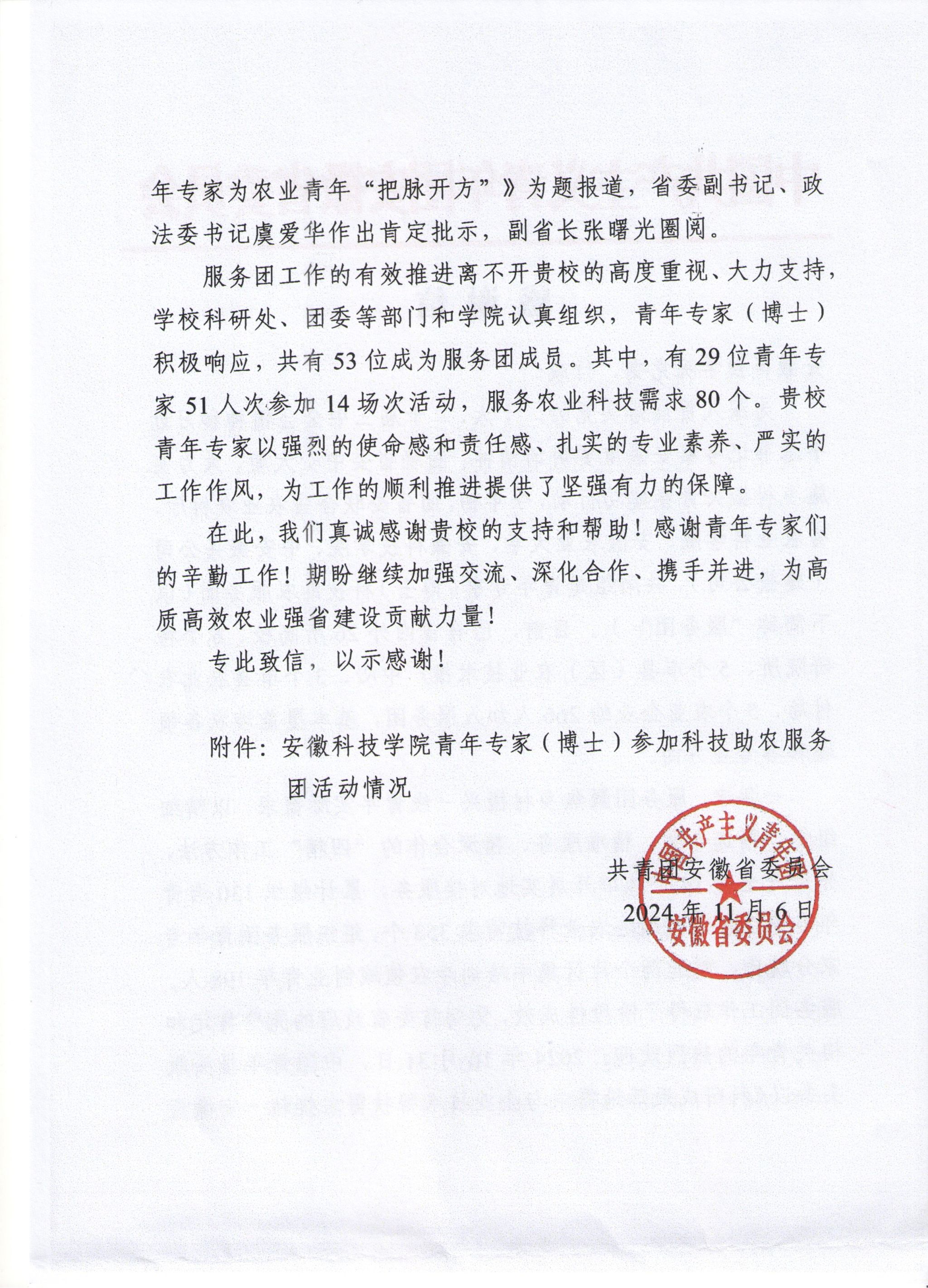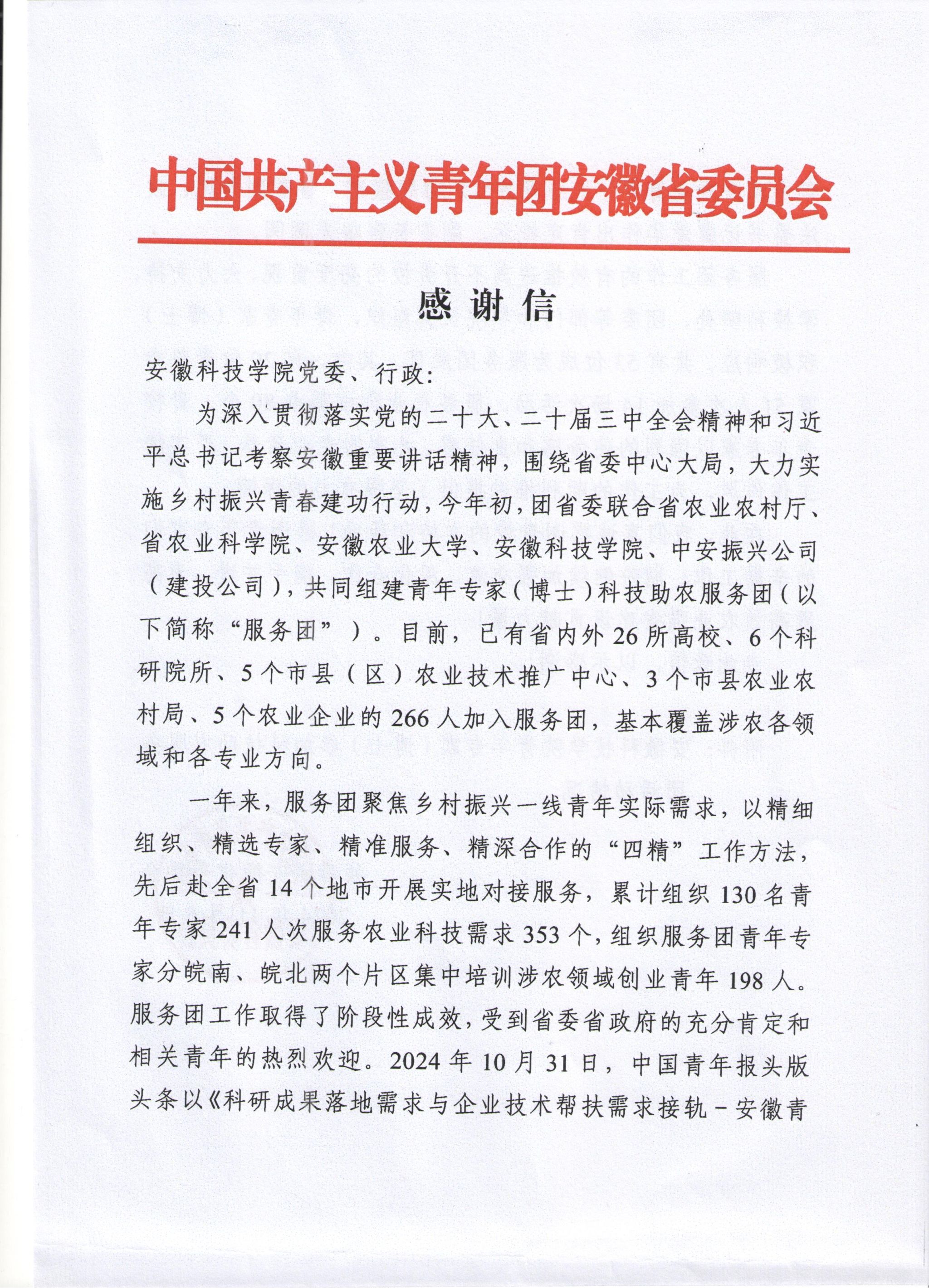 近日,共青团安徽省委员会向大棋牌发来感谢信,感谢大棋牌青年专家(博士)在科技助农服务团中付出的辛勤工作,并表述期盼继续加强交流、深化合作、携手并进,为高质高效农业强省建设贡献力量。