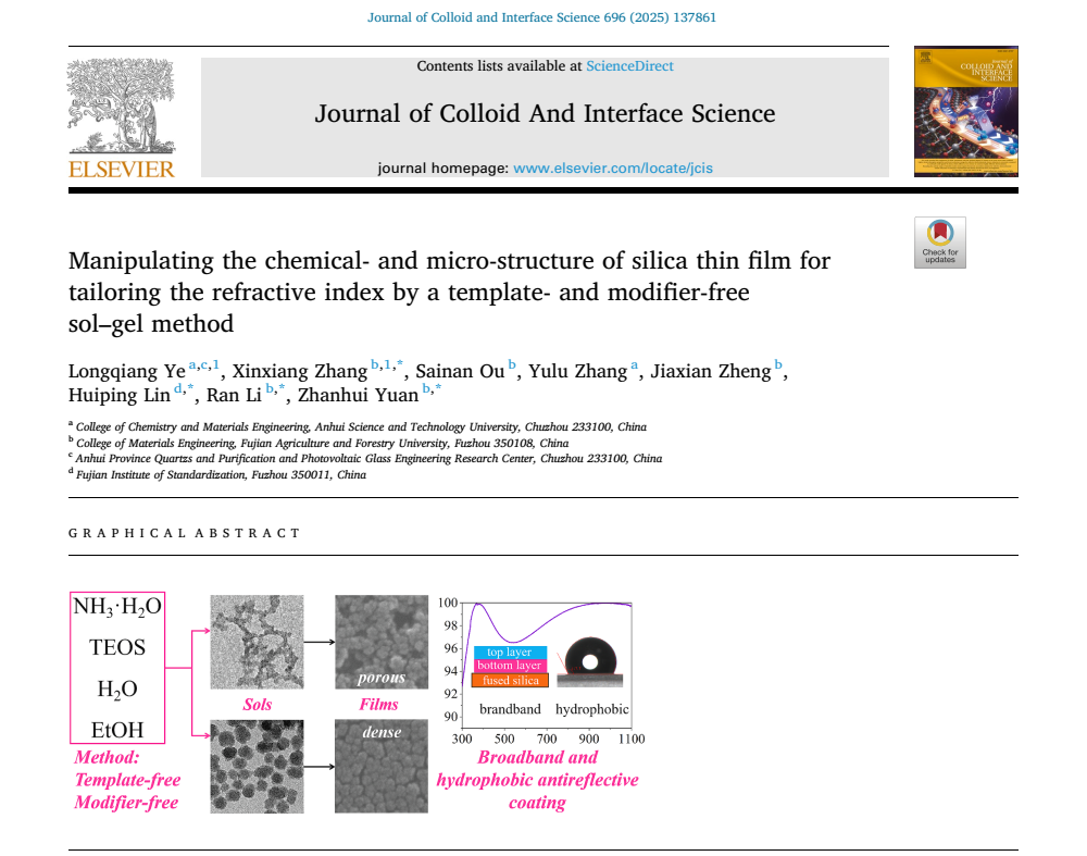 近日,大棋牌化学与材料工程学院硅基新材料团队联合福建农林大学等单位在胶体与界面科学领域顶级期刊《Journal of Colloid and Interface Science》(中国科学院1区期刊,IF=9.4)发表了题为“Manipulating the chemical- and micro-structure of silica thin film for tailoring the refractive index by a template- and modifier-free sol-gel method”的研究论文。