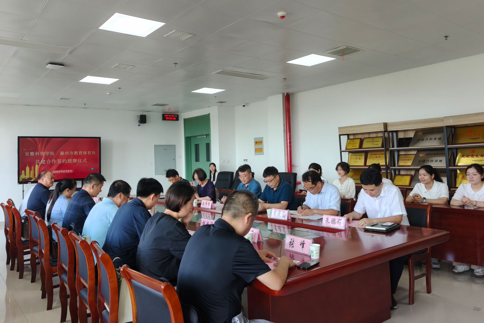 8月8日上午,校党委委员、副院长赵伟峰出席安徽科技学院与滁州市教育体育局共建合作签约授牌仪式。滁州市委教体工委委员、市教体局副局长李志及教体局相关科室负责人,滁州市区六所中学负责人;教务处、人文学院、外国语学院有关人员出席仪式。仪式由教务处副处长(主持工作)舒英杰主持。