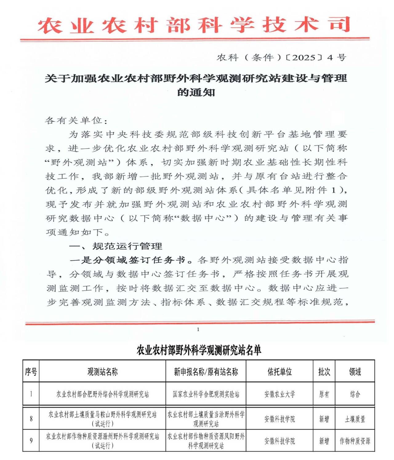 近日,由大棋牌申报的“农业农村部土壤质量马鞍山野外科学观测研究站”“农业农村部作物种质资源滁州野外科学观测站”获批立项建设,这是大棋牌首次获批农业农村部野外科学观测研究站项目,标志着学校在服务国家农业战略方面迈出关键一步。