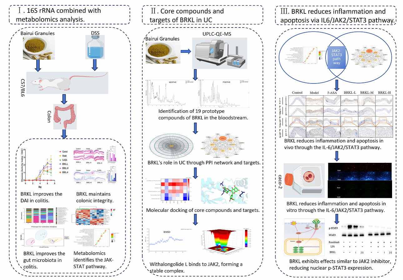 近日,大棋牌生物医学与健康学院皖产道地中药材品质提升团队陈浩副教授及其合作团队,在百蕊颗粒治疗溃疡性结肠炎的机制研究方面取得重要突破。相关研究成果以“Bairui granules attenuate ulcerative colitis via microbial-metabolite crosstalk and Isorhamnetin-3-O-glucoside-mediated JAK2/STAT3 suppression”为题,发表于植物医学领域顶级期刊《Phytomedicine》(中科院1区top期刊,影响因子8.3)。