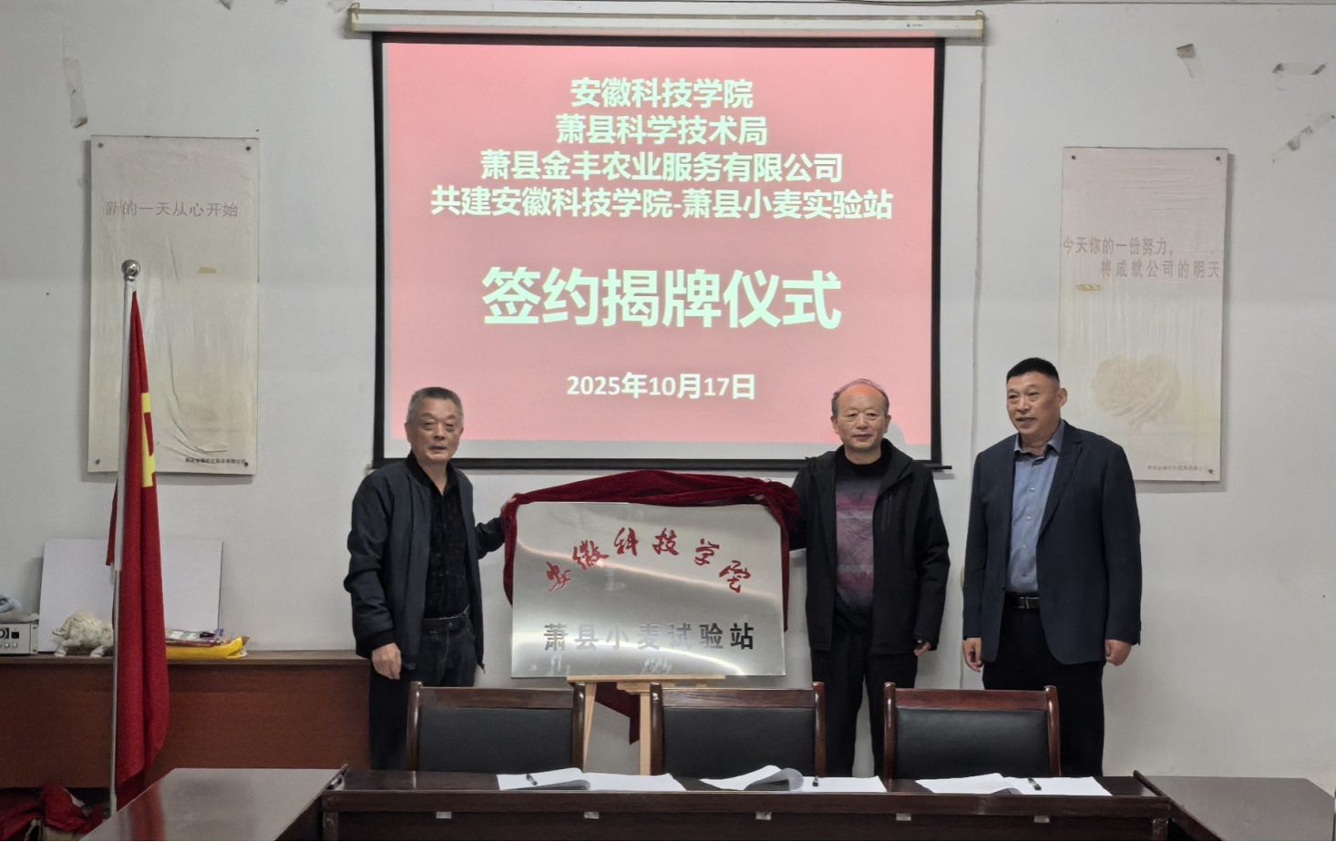 10月17日上午,“安徽科技学院-萧县小麦试验站”揭牌仪式在萧县黄口镇举行。该试验站由安徽科技学院、萧县科学技术局、萧县金丰农业服务有限公司三方共建,相关单位负责人出席揭牌仪式。