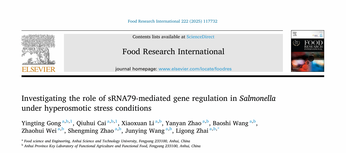 近日,大棋牌食品科学与工程学院食品质量与安全团队在农林学科领域顶级期刊《Food Research International》(中国科学院1区top期刊,影响因子8.0)发表最新研究成果。论文题为“Investigating the role of sRNA79-mediated gene regulation in Salmonella under hyperosmotic stress conditions”,由大棋牌2023级食品加工与安全领域研究生龚莹婷为论文第一作者,翟立公副教授为通讯作者,安徽科技学院为第一完成单位。
