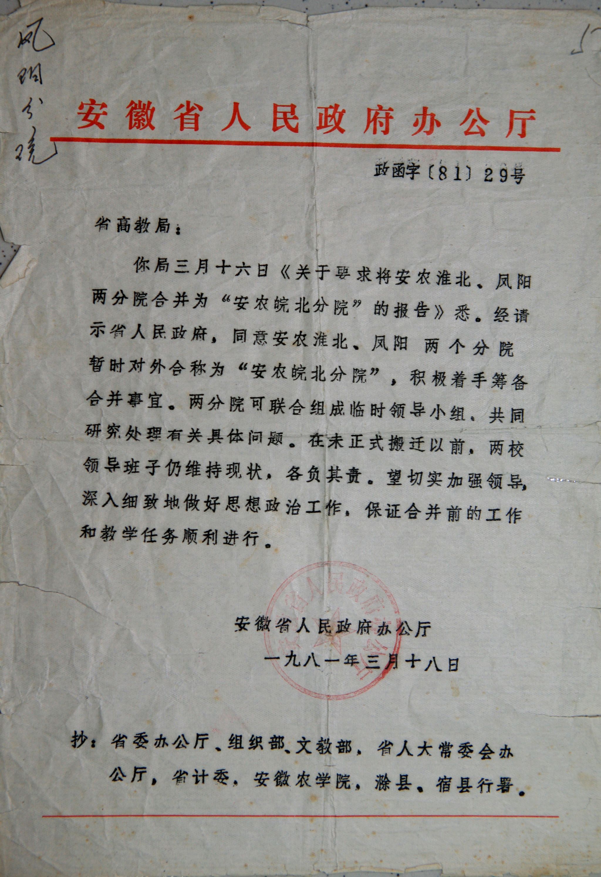 根据中央“调整、整顿、充实、提高”的八字方针和省委办三个农学院的决策,安徽省人民政府办公厅于1981年3月18日下发了政函字〔1981〕29号文:“省人民政府同意安农淮北、凤阳两个分院暂时对外合称安农皖北分院,积极着手筹备合并事宜”。皖北农学院在国家教育部未批准前,“暂时对外合称‘安农皖北分院’”,与安徽农学院脱离隶属关系,属正厅级建制,直属省政府领导。