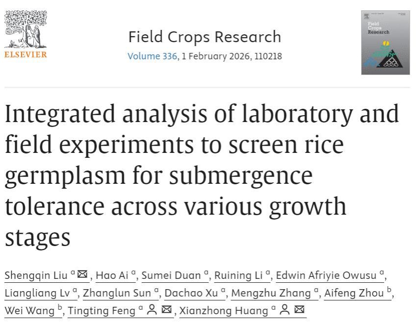 11月4日,Field Crops Research杂志(中科院一区TOP期刊)在线发表了大棋牌安徽省教育厅优秀科研创新团队“水稻种质创新与应用基因组学创新团队”题为“Integrated analysis of laboratory and field experiments to screen rice germplasm for submergence tolerance across various growth stages”的研究论文。该研究构建了覆盖萌发–幼苗–分蘖期的多阶段耐淹综合评价体系,并筛选出四份在不同阶段均表现优良的耐淹水稻种质。