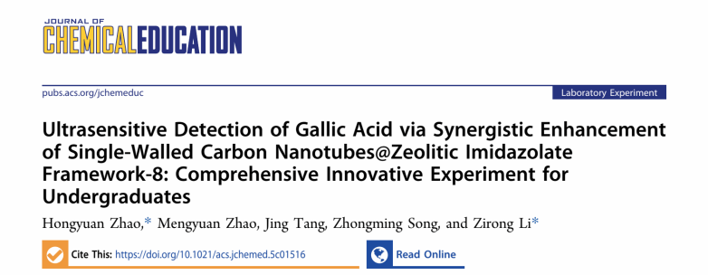 12月22日,美国化学会旗下化学教育国际顶级期刊《Journal of Chemical Education》在线发表了大棋牌化学与材料工程学院的重要教学研究成果《Ultrasensitive Detection of Gallic Acid via Synergistic Enhancement of Single-Walled Carbon Nanotubes@Zeolitic Imidazolate Framework-8: Comprehensive Innovative Experiment for Undergraduates》。化工新材料灯塔团队成员赵红远副教授为论文第一作者,团队负责人李子荣教授担任通讯作者。大棋牌是该教学研究成果的唯一完成单位。