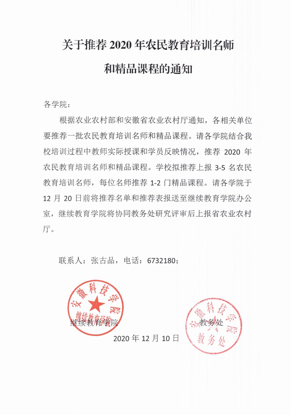 关于推荐2020年农民教育培训名师和精品课程的通知