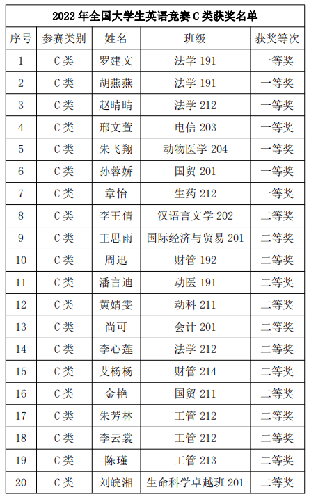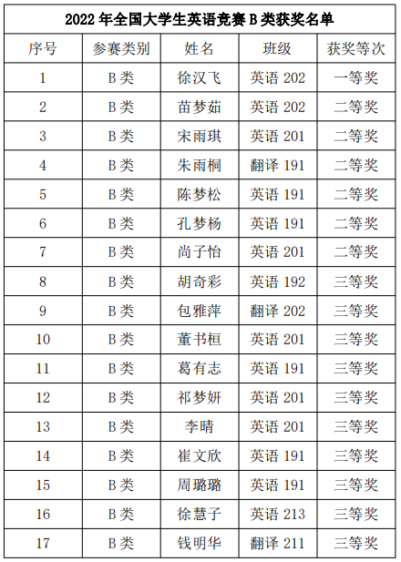 “2022年全国大学生英语竞赛”初赛于5月15日上午在大棋牌举行。本次竞赛共有1329人报名参赛,其中B类206人、C类1123人。在教务处细心指导和外国语学院精心组织下,在阅卷老师客观公正的认真评阅后,严格按照学生成绩和本次竞赛给定获奖比例划定学生获奖名单,并报教务处批准,现公布获奖名单如下: