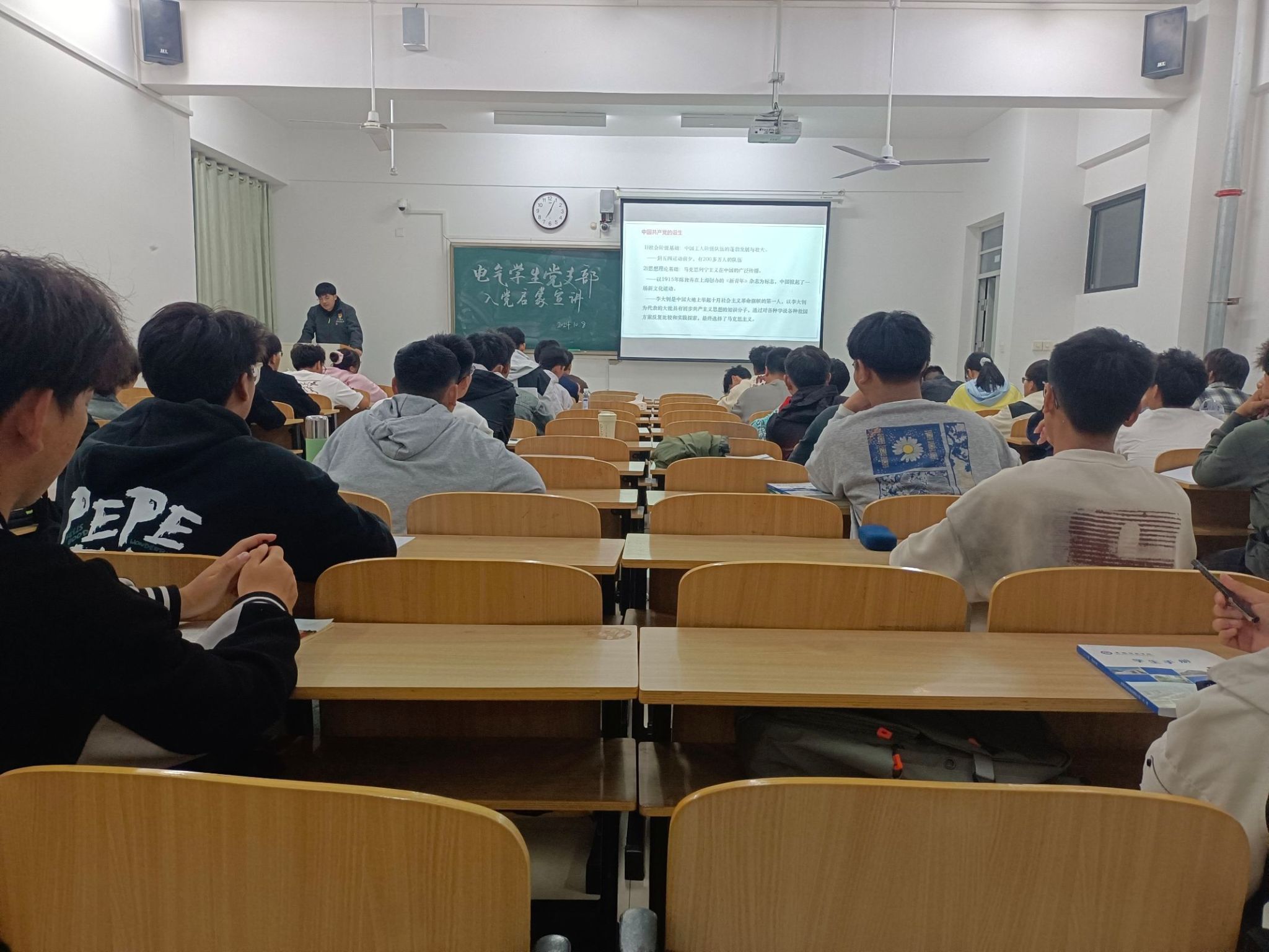 为引导大学生积极向党组织靠拢,10月8日晚,电气专业学生党支部组织学生党员在2024级新生班级中开展入党启蒙教育,学院有关教师全程指导。