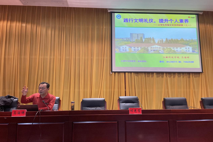 为传承弘扬中华优秀传统文化,提升大学生综合文化素养,丰富大学生的礼仪知识,培养大学生文明习惯,营造浓厚的学院文化氛围,11月10日下午,食品工程学院在图书馆二楼报告厅举办了2024级新生文明礼仪专题讲座,人文学院退休教师马海祥副教授受邀担任主讲人,学院全体辅导员及新生聆听讲座。讲座由学院党委书记付光玺主持。