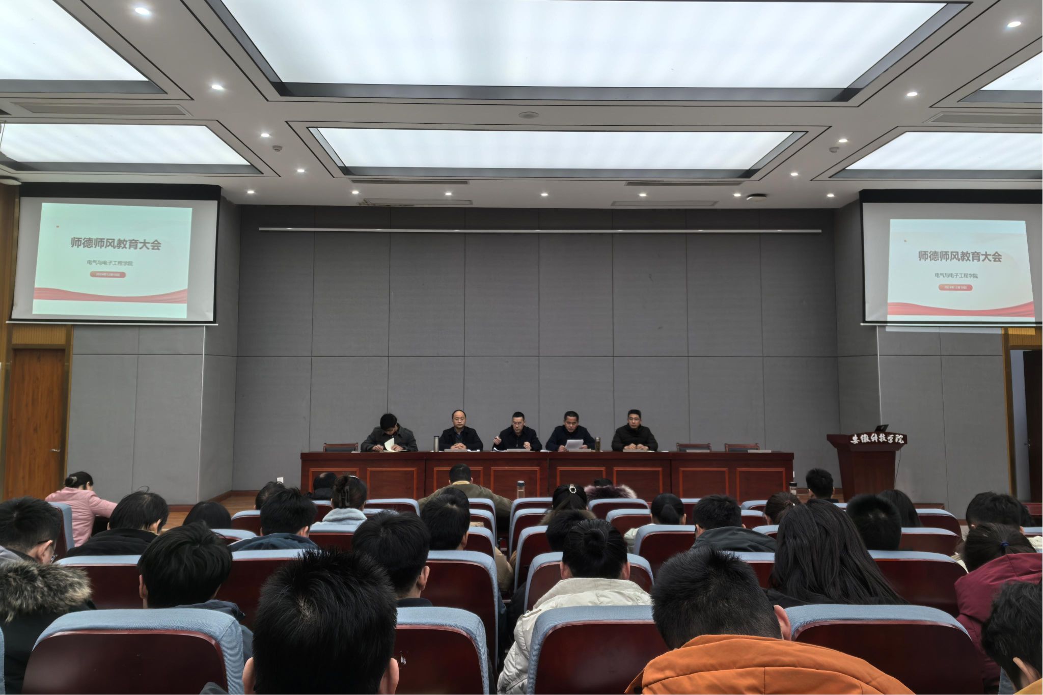 12月18日,电气与电子工程学院师德师风专题教育大会在敏行楼B报告厅举行。学院党政领导及全体教职工参加会议,会议由学院党委书记骆海邦主持。