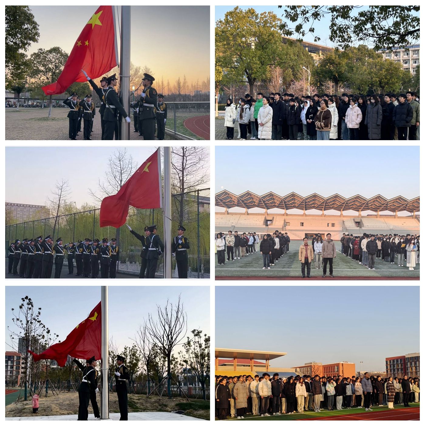 6点40分,升旗仪式正式开始。校国旗护卫队队员们迈着整齐的步伐入场,将五星红旗护送至国旗台前。随着国歌响起,擎旗手振臂一挥,鲜艳的五星红旗随风飘扬。全体师生肃立,面向国旗行注目礼。