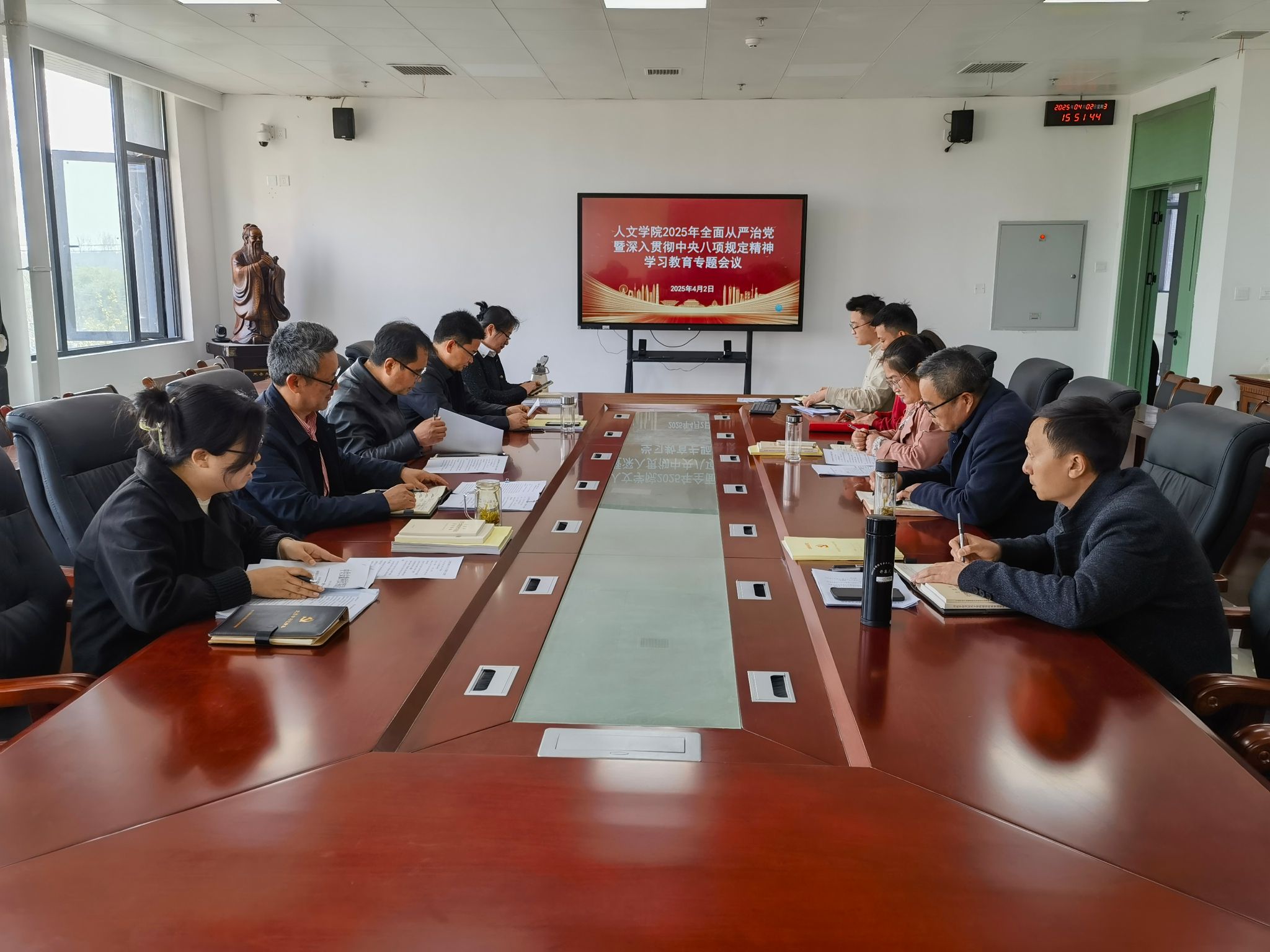 4月2日下午,人文学院召开2025年全面从严治党暨深入贯彻中央八项规定精神学习教育专题会议,学院党政领导、党委委员和全体党支部书记,各系、教研室主任,党政办公室和团委负责人参加。会议由学院党委副书记、院长李晓东主持。