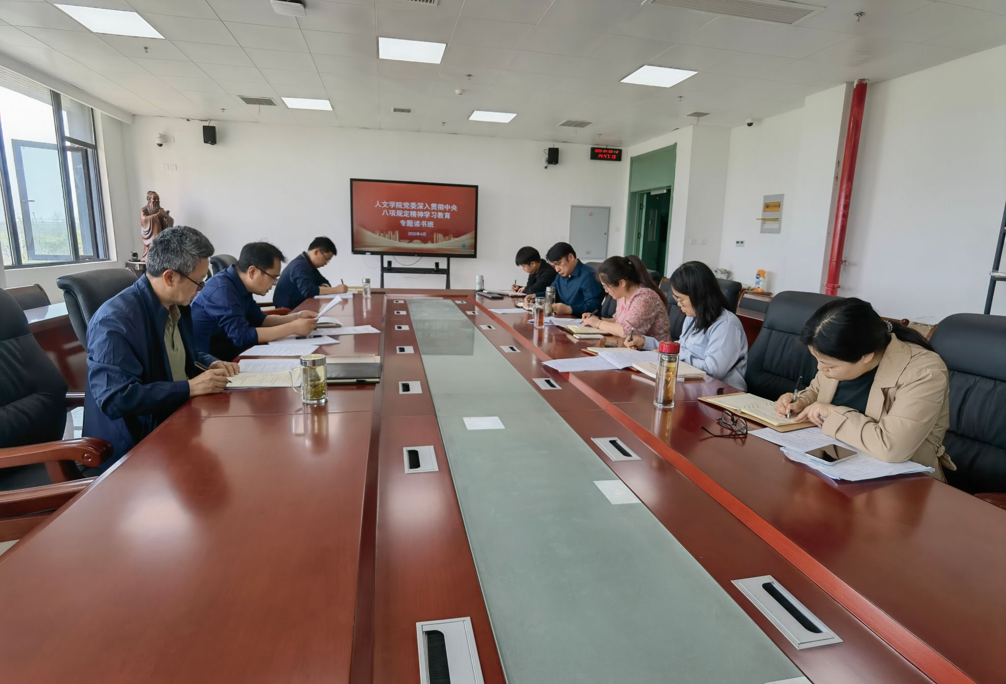 根据学校党委学习教育工作部署,4月8日至9日,人文学院党委利用两个半天时间,采取个人自学、集中学习与集体研讨相结合的方式,举办深入贯彻中央八项规定精神学习教育专题读书班。学院全体处级党员领导干部、党委委员参加读书班学习,各党支部书记列席。