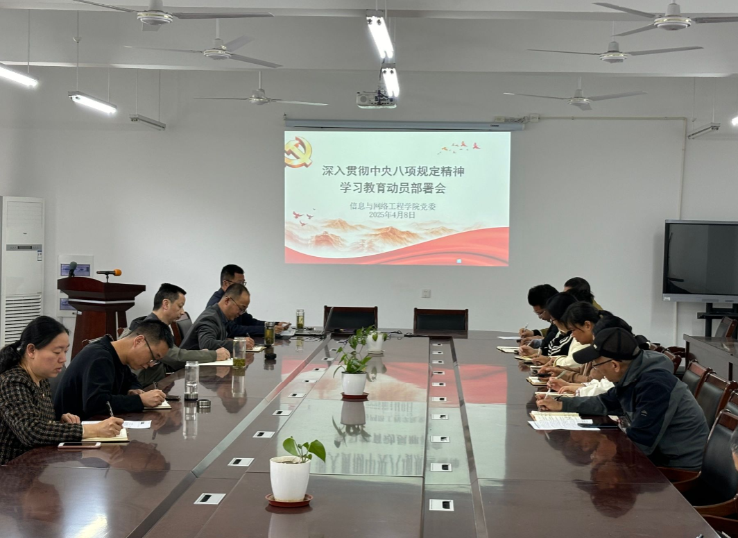 4月8日上午,信息与网络工程学院党委在龙湖校区尚行楼B418会议室召开深入贯彻中央八项规定精神学习教育动员部署会。学院党委委员、纪委委员、各党支部书记、各系部主任、实验室主任及科级以上干部参加会议。会议由学院党委书记王振其主持。