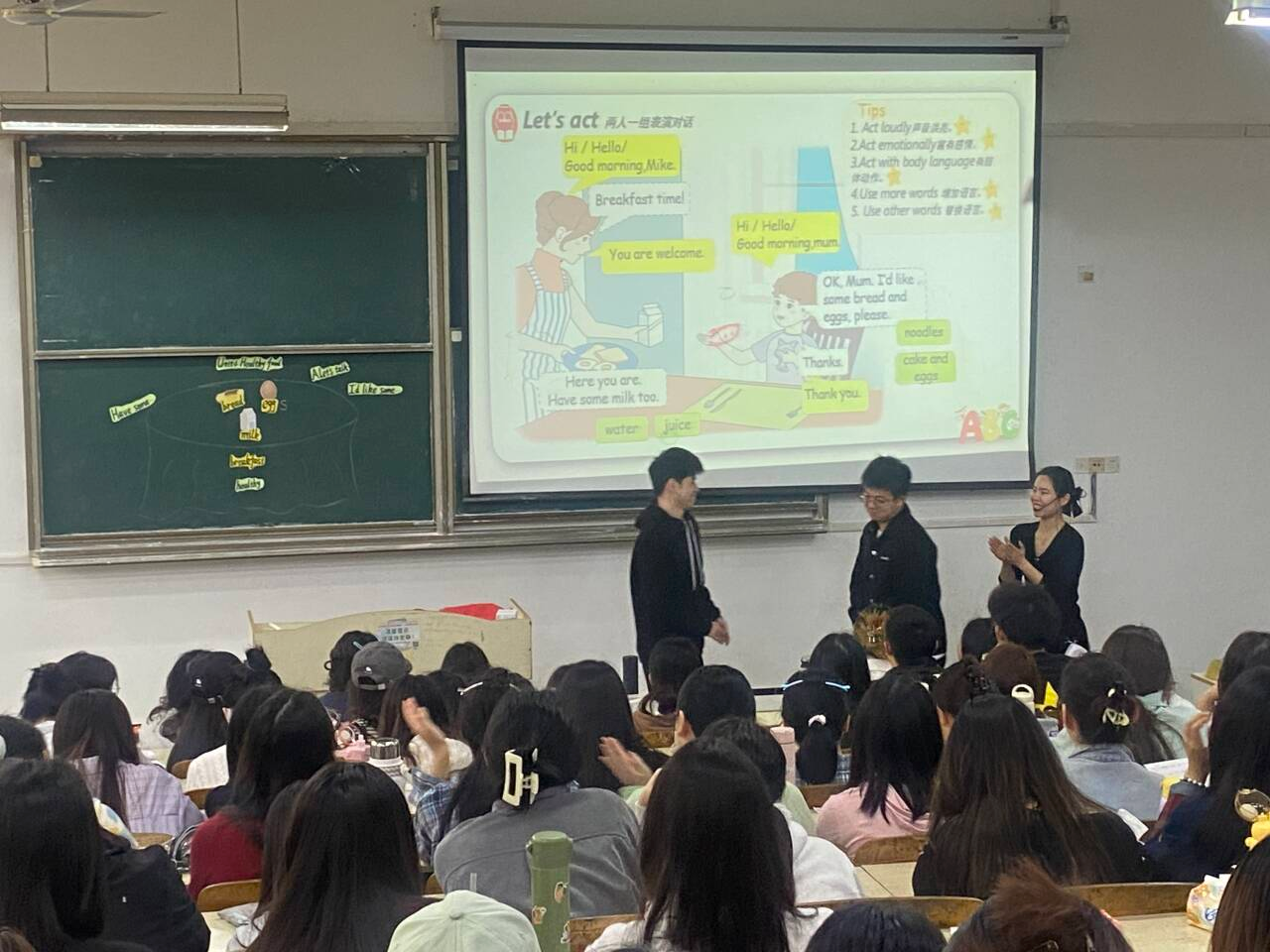 戴世纯以“Healthy food”为主题,展示了一堂精彩纷呈的小学英语示范课。戴老师科学的教学设计、充满活力的讲解、有效的师生互动、流畅的英语表达给学生留下深刻印象。此外,戴老师还分享了教师面试的注意要点,内容涵盖仪容仪表、教态、教学基本功以及板书设计等多个方面,为学生们开启未来职业发展大门提供了参考。