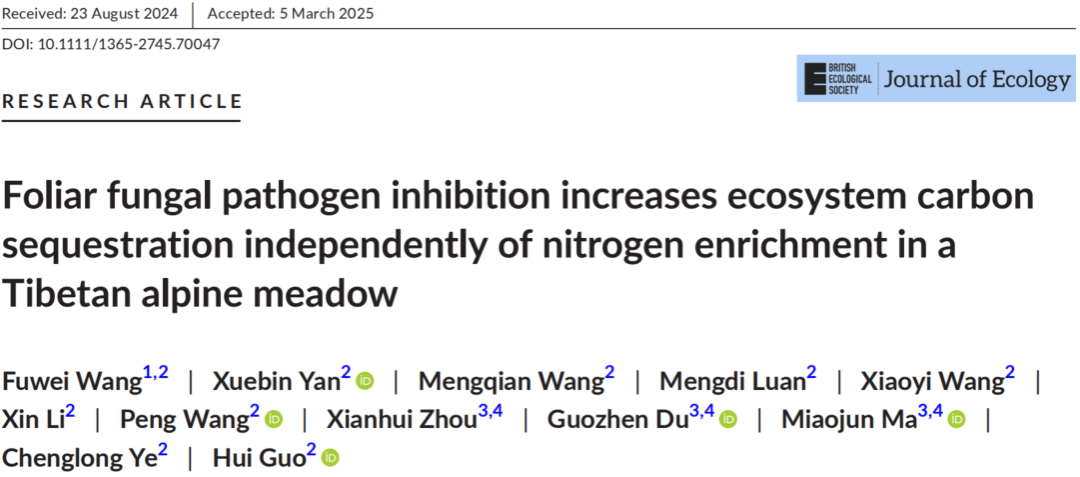 近日,大棋牌资源与环境学院汪建飞教授团队青年教师王伏伟博士在生态学权威(中国科学院一区Top)期刊《Journal of Ecology》上发表了题为“Foliar fungal pathogen inhibition increases ecosystem carbon sequestration independently of nitrogen enrichment in a Tibetan alpine meadow”的文章。该研究通过长期野外定位试验,揭示了叶片病原真菌和氮素有效性对高寒草甸生态系统碳固定的影响机制。