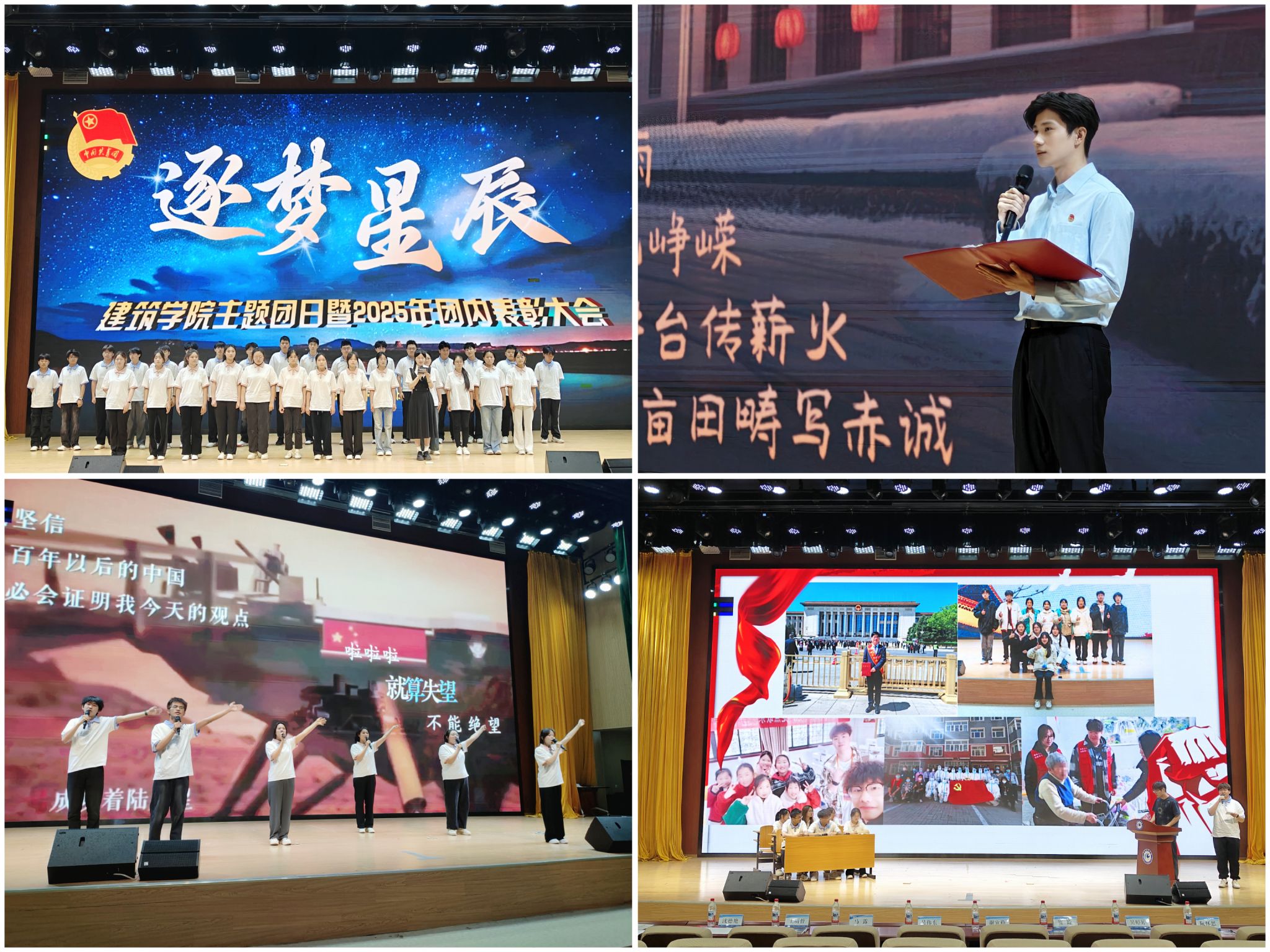 现场,“星火启航”“星辉传承”“星愿致远”“星途创新”“星誓辉煌”五个篇章依次展开。一场校史回溯之旅照亮了同学们的逐梦之路。青马学员、入团积极分子等通过歌曲《倔强》以歌抒志,鼓舞着大家在逆境中振翅高飞。毕业生视频《禾下扬帆·校训之光》拾起2025届毕业生积极奋进的瞬间,以袁隆平对青年的寄语为线索,展现毕业生在校训精神的引领下,将个人成长融入国家发展的大潮之中。校先进团支部城乡规划232班通过情景剧《拾光》,以大学生对红色文化从疏离到转变为切入点,诠释了创新让红色基因在新时代绽放光彩。