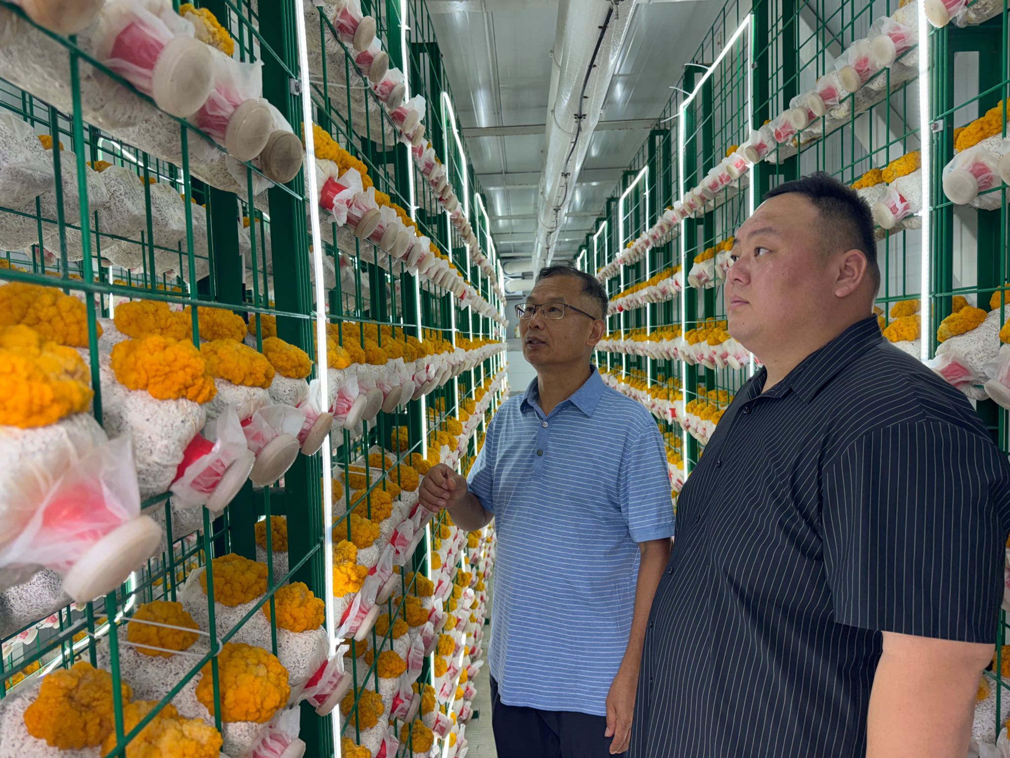 何华奇一行首先到达蒙城县秀臻菇农业种植专业合作社。在何华奇等专家的指导下,该合作社成立于2022年2月,主要栽培猪肚菇,合作社成立后专家团队经常到该基地指导生产,解决生产中的难题,企业运行良好,获得较高的经济效益。随后何华奇一行到达安徽宝城智汇农业有限公司,通过实地查看温湿度等传感器数据、观察平菇、杏鲍菇、金耳、香菇、灵芝等生长状态,提供精准化管理建议,以确保生产高质量的食用菌产品。这是何华奇教授本月第二次到该公司指导生产。最后何华奇一行赶到利辛县安徽共富食用菌有限公司,对高温下金福菇的管理要点提出合理化建议。专家团队和共富食用菌有着多年的产学研合作基础,2023年联手成功申报安徽省教育厅高校协同创新项目《羊肚菌高产优质新品种的选育及栽培技术研究》(GXXT-2023-080),为企业生产提供了强有力的技术支持。