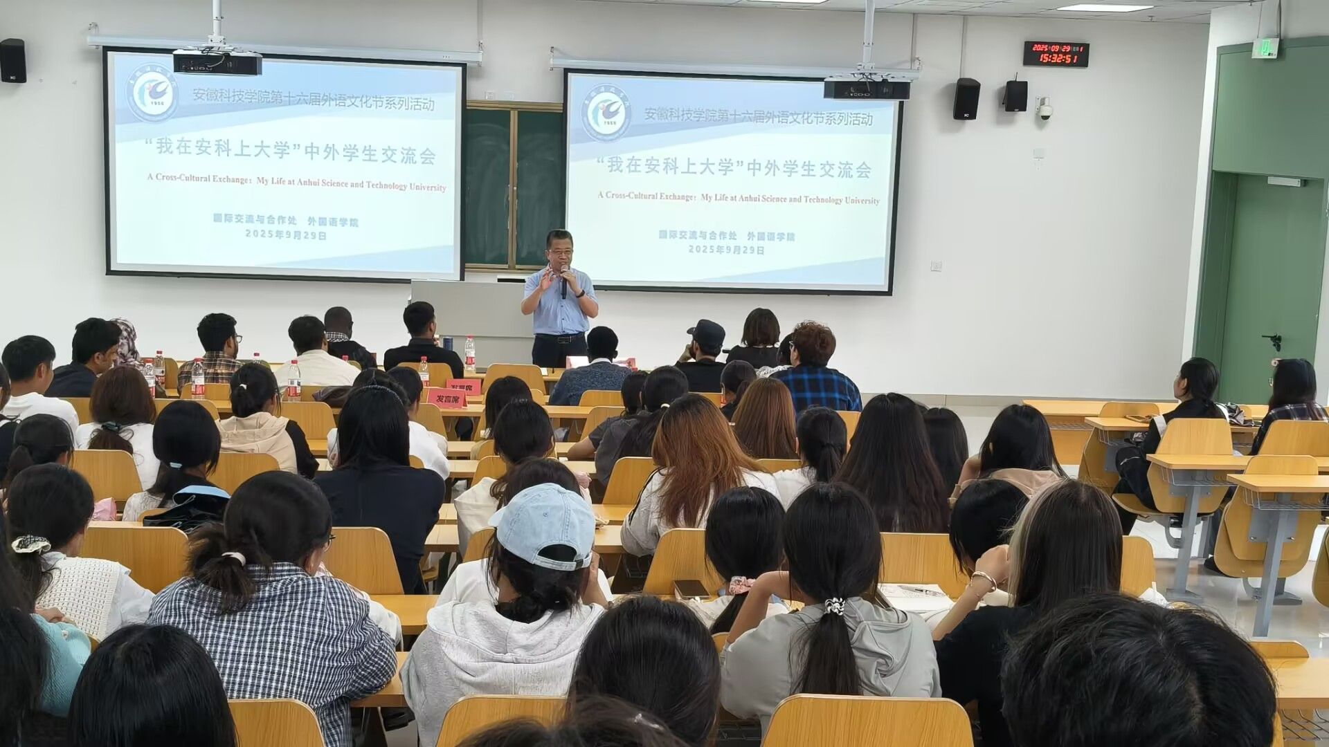 9月29日下午,安徽科技学院第十六届外语文化节之“我在安科上大学”中外学生交流会在滁州校区学术报告厅举行。国际交流与合作处处长何世潮,外国语学院党委书记蔡为青、党委副书记张海亮出席,150余名中外学子参与交流。