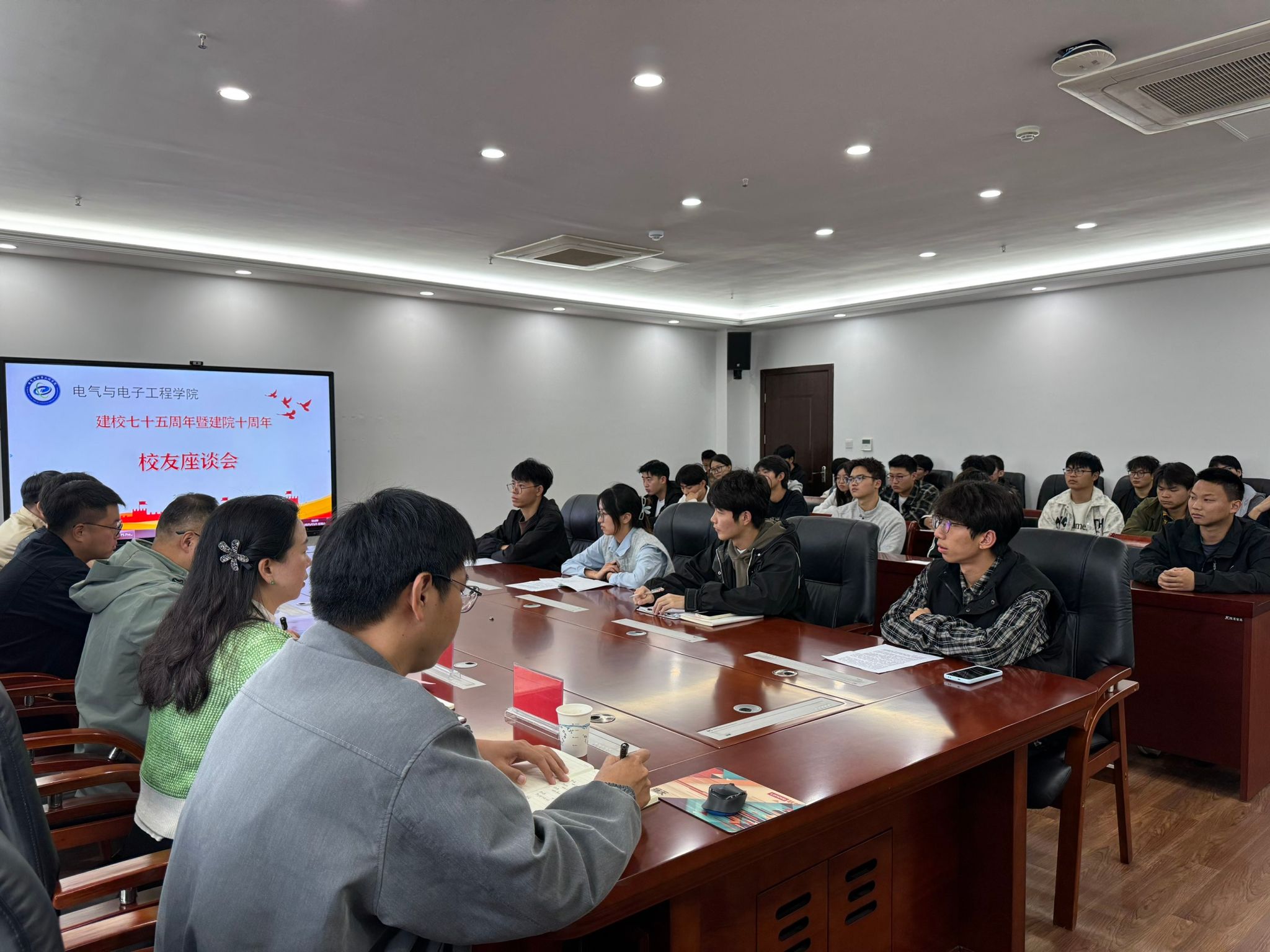 适逢学校建校七十五周年暨学院成立十周年之际,电气与电子工程学院特邀多位校友重返校园,共忆往昔岁月,畅谈师生情谊与发展愿景。11月1日下午,校友座谈会在西附楼317会议室顺利召开。2019届与2020届校友代表与学院在校生进行了深入地交流。学院党委副书记尚磊出席会议并致辞,学院有关教师和在校生代表参加会议。会议由学院党政办公室主任王延丽主持。