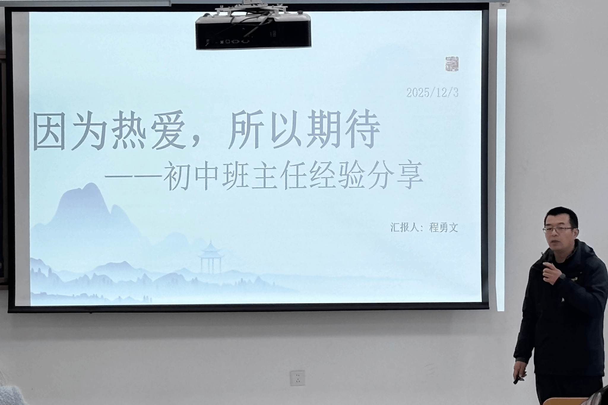 为深化师范生职业认知、提升实践育人能力,12月3日下午,人文学院在学思楼5号楼108教室举办“因为热爱,所以期待——初中班主任的经验分享”专题讲座。讲座特邀滁州市琅琊实验学校高级教师程勇文主讲,2024级汉语言文学专业全体学生参加,由中文系主任胡春艳主持。