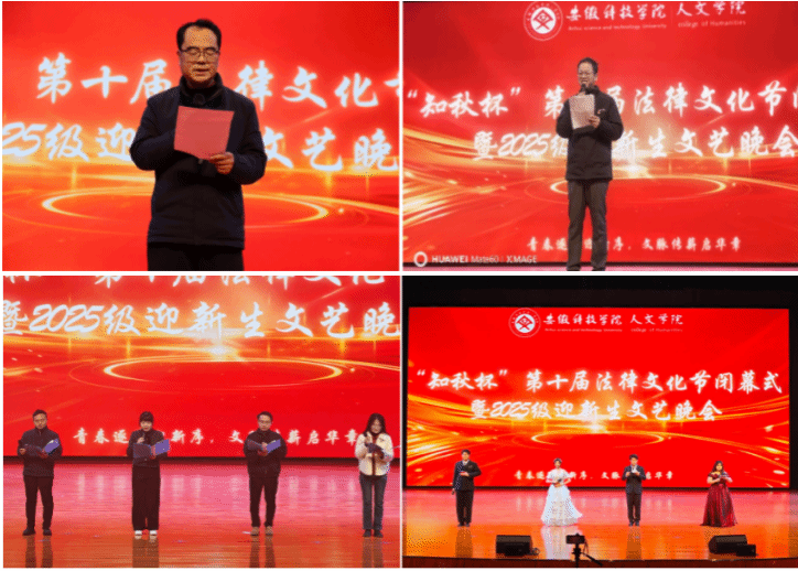 12月10日,人文学院“知秋杯”第十届法律文化节闭幕式暨2025级迎新生文艺晚会在知行礼堂举行。安徽知秋律师事务所主任、首席合伙人宫鉴,执行主任、高级合伙人耿晓兵,人文学院党政领导、教师代表、全体辅导员出席活动,2025级全体新生及部分老生代表参加活动。