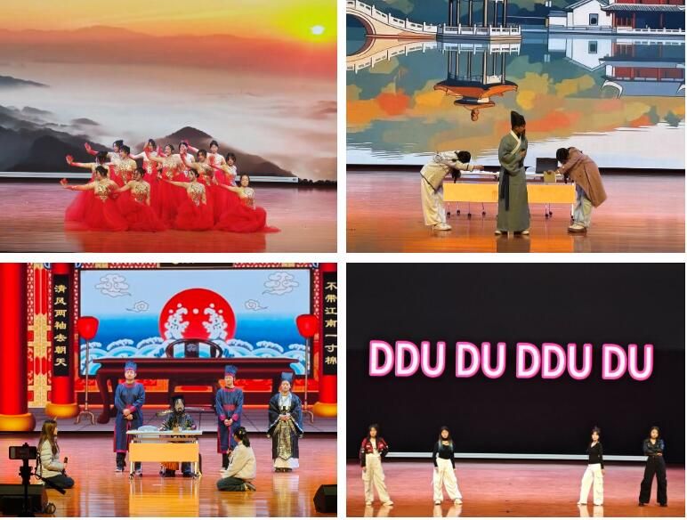 文艺晚会环节精彩纷呈,为现场观众呈现了一场兼具思想性、艺术性与观赏性的文化盛宴。开场舞《ddu du ddu du》以活力四射的节奏、舒展奔放的舞姿瞬间点燃全场氛围;法律小品《包大人断案“量子记忆贴”》巧妙融合法学知识与趣味剧情,将法学特色与舞台艺术完美结合,引得现场笑声与掌声不断;歌曲串烧以宛转悠扬的歌声传递青春心语,细腻情感直抵人心;话剧《盼蜓归期》凭借演员们细腻生动的演绎,深刻诠释故事内涵,引发观众强烈情感共鸣;舞蹈《What is love》节奏轻快、风格活泼,灵动舞步尽显青年学子的蓬勃朝气;舞台剧《琅琊山下的跨世对话》以独特的叙事视角搭建时空桥梁,带领观众沉浸式感受故事魅力;舞蹈《万疆》则以大气磅礴的编排、舒展优美的舞姿,生动诠释了家国情怀的厚重底蕴与温暖力量;教师朗诵《弦歌不辍七十五载,人文薪火永相传》以深情激昂的语调、真挚饱满的情感,回望学院发展历程,展望人文未来愿景,为整场晚会画上圆满句号。