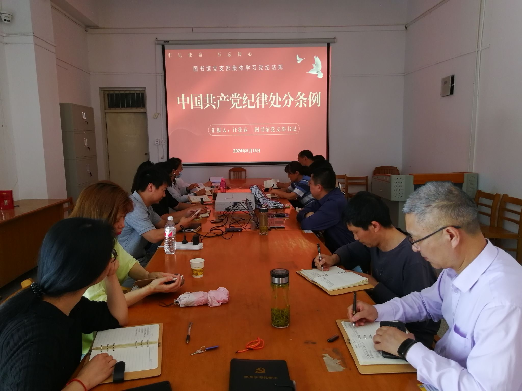 为深入学习贯彻习近平总书记关于党纪学习教育的重要讲话和重要指示精神,5月15日下午,图书馆党支部通过专题党课学习了新修订的《中国共产党纪律处分条例》(以下简称《条例》),党支部书记汪徐春在专题党课上对《条例》进行深入解读,图书馆党支部全体党员和科级以上干部参加。