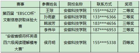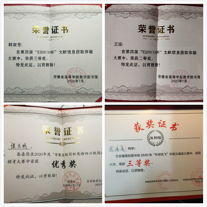 此外,在安徽省高等学校数字图书馆举办的“第四届‘EBSCO杯’文献信息获取体验大赛”中、 “安徽省银符杯英语四六级阅读理解模考大赛”中,大棋牌学子也取得了良好的成绩。获奖名单如下: