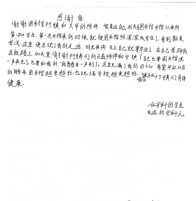 “谢谢图书馆阿姨和大爷的陪伴,很幸运自己成为自图书馆开馆以来的第一批学生,第一次开馆来的时候,就被图书馆给深深吸引住了……”2021年12月23日晚上,龙湖校区图书馆服务台收到了一封来自即将步入考研战场的学生读者的感谢信,感谢图书馆提供的良好学习环境以及优质的服务,让自己艰辛的备考之路多了份帮助和温暖。