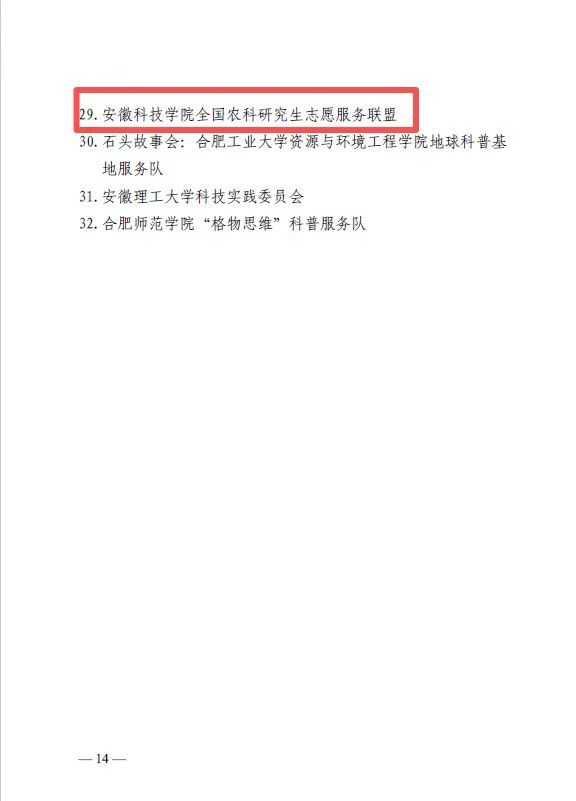近日,长三角科技志愿服务联盟正式公布 2025 年度长三角科技志愿服务先进典型名单,由安徽科技学院牵头组建的全国农科研究生志愿服务联盟凭借突出的服务成效与鲜明的农科特色,获评 “2025年度长三角优秀科技志愿服务组织”称号;安徽科技学院“科技支教传薪火,产业帮扶助振兴” 研究生支教团项目同步获评“2025 年度长三角优秀科技志愿服务品牌活动”。