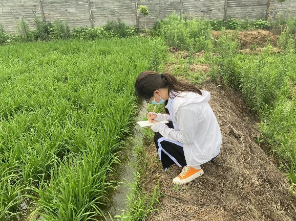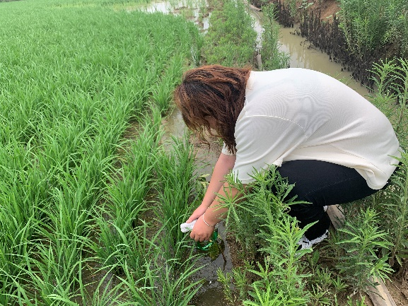 在小岗种业水稻基地,基地里的水稻正处于营养生长分蘖期,实时动态掌握水稻分蘖情况是了解水稻长势、合理布置水肥的重要条件,从而促进成穗率的提高,提高水稻产量。小队成员在小岗种业副总傅先来的带领下穿上水鞋、带上草帽,走下田埂协助查苗、记录实时水稻分蘖情况。今年进入梅雨季节后,基地已通过开展严控田间水位、增施特种肥料、开展病虫害防治等工作保障水稻营养生长。