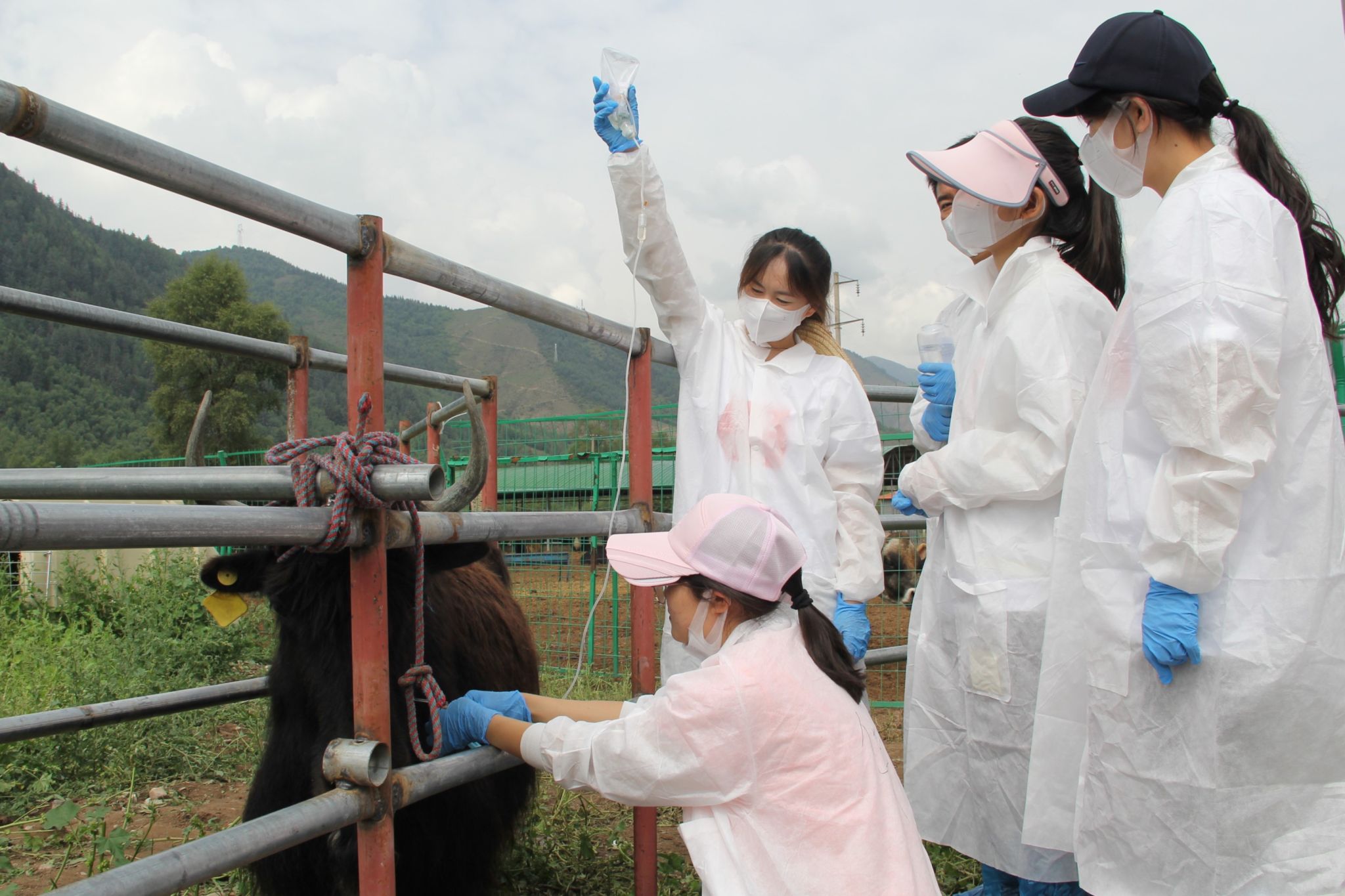 钟董兰正在和同学为牦牛诊治疾病(站立左一)